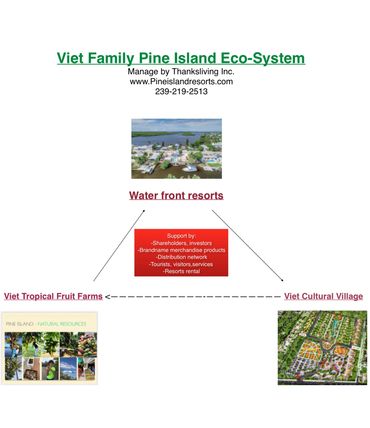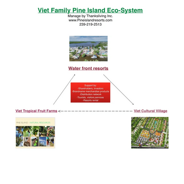 Thanksliving is a company aims to maintain, expand and create new Business Enterprise in an exclusive island with current existing infrastructure. The goal is to build a Family Pine Island Eco-System. The Eco-System comprises of multi-mini waterfront resorts, tropical fruit farms and a cultural village with outdoor marketplaces, shops, restaurants and digital education with real life onsite learning, living and touring experiences of Vietnamese language, food, history and way of life in an exclusive tropical island of Florida.